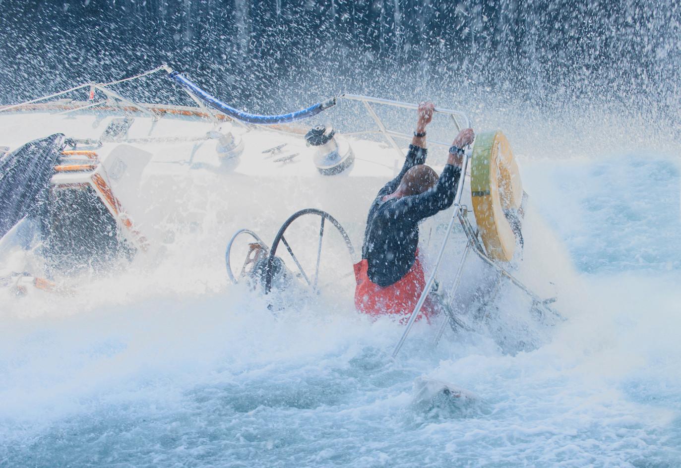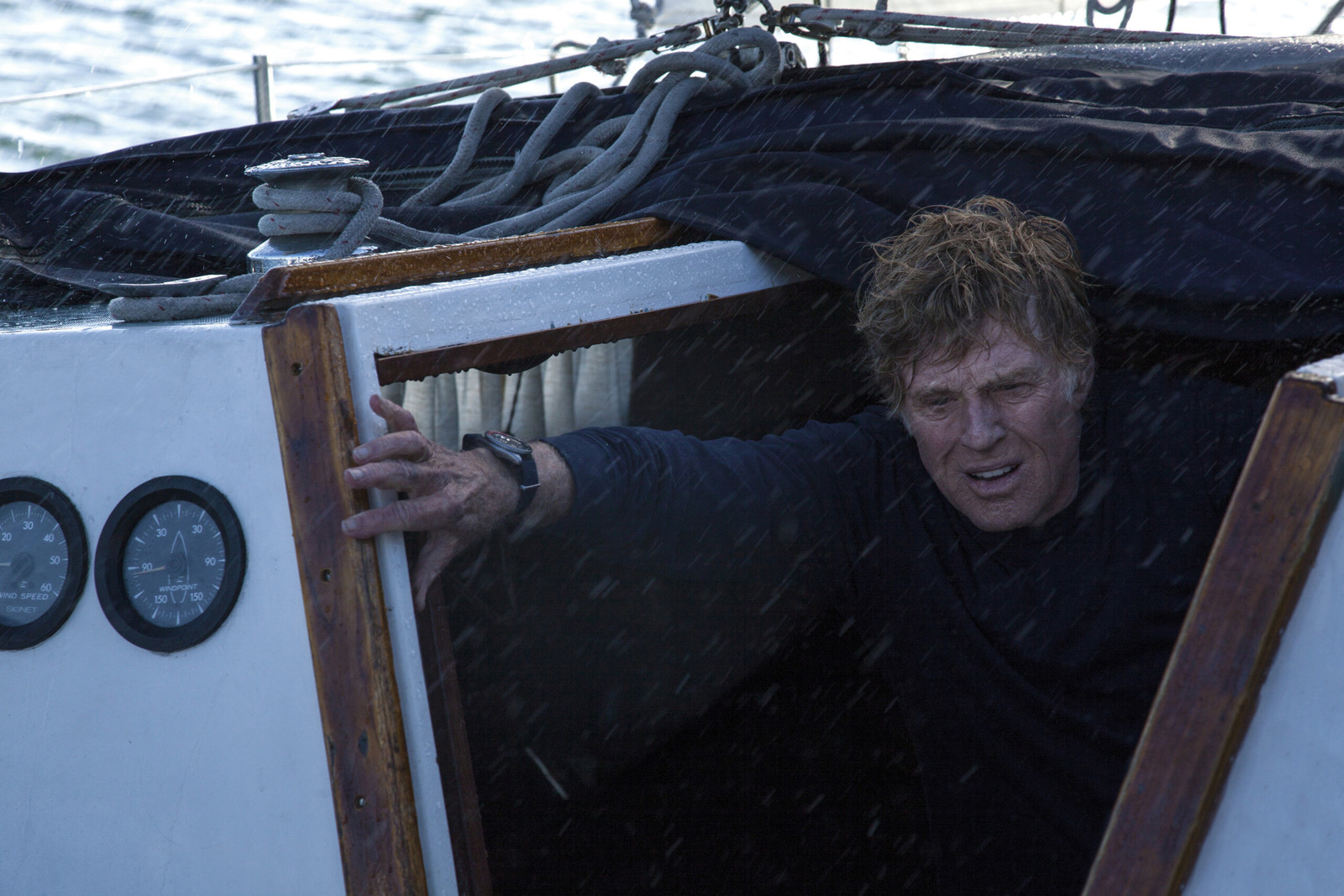 Privé de sa radio et de ses instruments de navigation, l’homme se laisse prendre dans une violente tempête. Malgré ses réparations, son génie marin et une force physique défiant les années, il y survit de justesse.