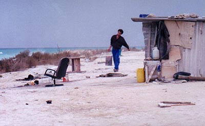 Une homme qui ne possède plus que la porte de sa maison, erre sur un train aride de l’île. Le facteur lui court après pour lui remettre du courrier…