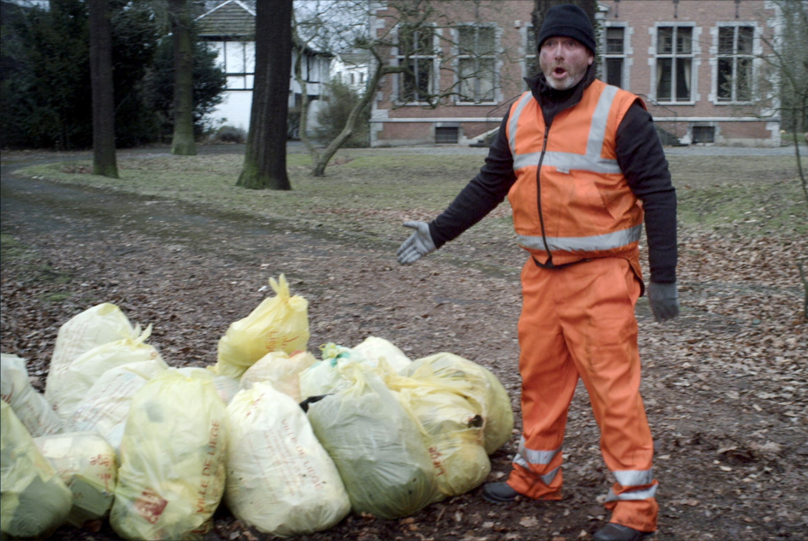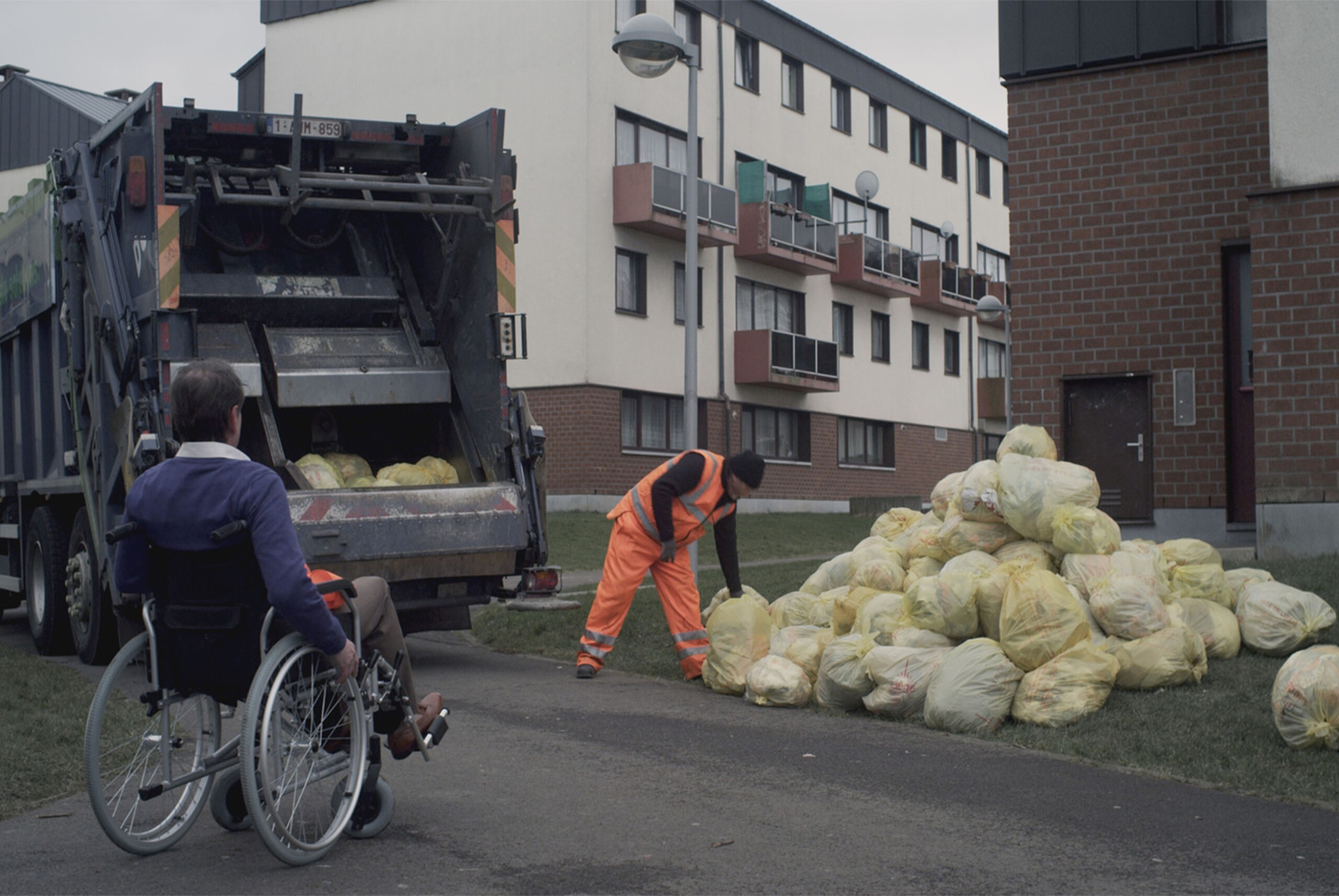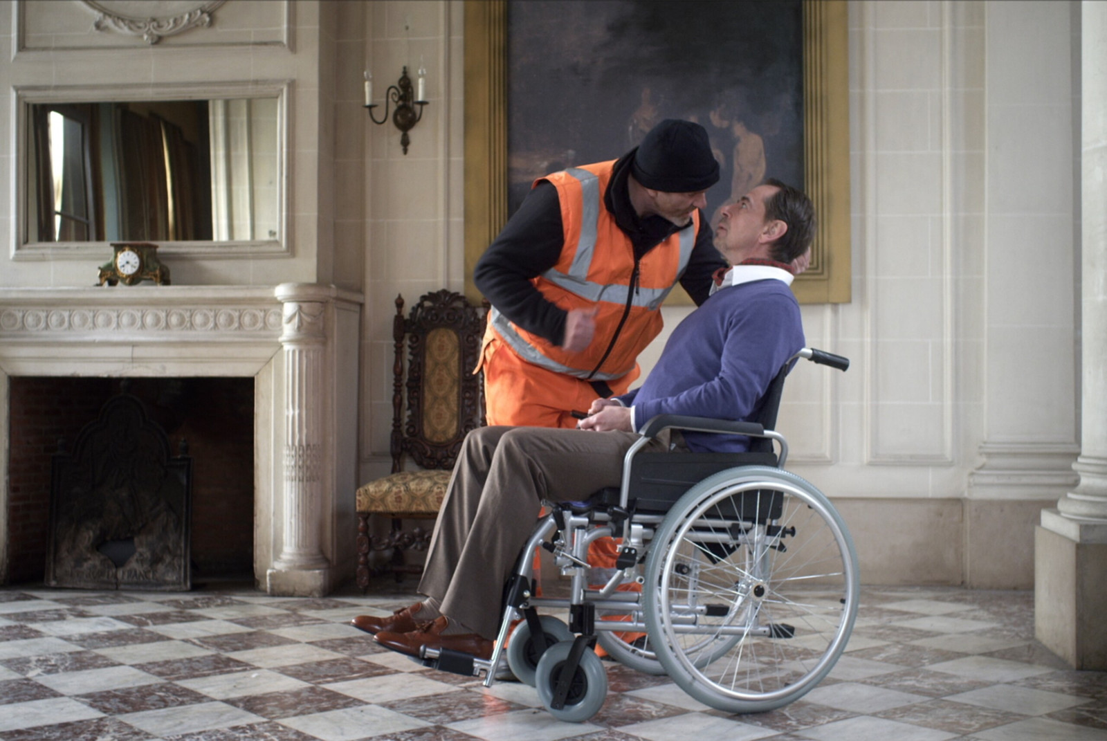 Georges, un éboueur très en colère, fonce vers la porte d’entrée d’une immense villa. « L’enculé de bourgeois » y habitant vient de blesser son collègue avec des poubelles remplies de déchets tranchants. Or, la porte s’ouvre et l’enculé en question est un handicapé en chaise roulante…